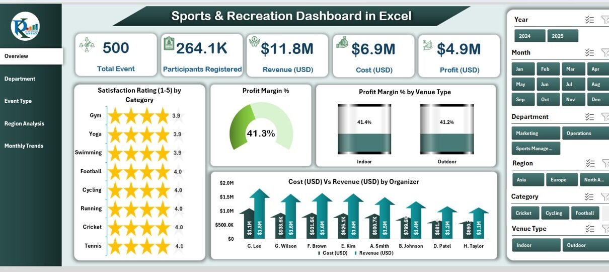 The Sports & Recreation Dashboard in Excel is a powerful, user-friendly, and cost-effective tool for tracking event performance, satisfaction levels, and profitability.