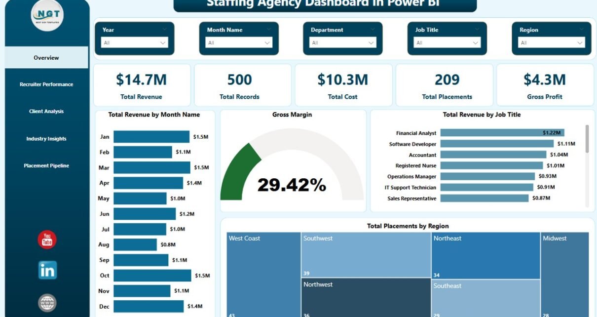 The Staffing Agency Dashboard in Power BI tracks 5 headline KPIs — Total Revenue, Total Records, Total Cost, Total Placements, and Gross Profit — plus 12+ supporting metrics including gross margin, revenue by month, time-to-fill by recruiter, satisfaction score by client, and placements by candidate source.