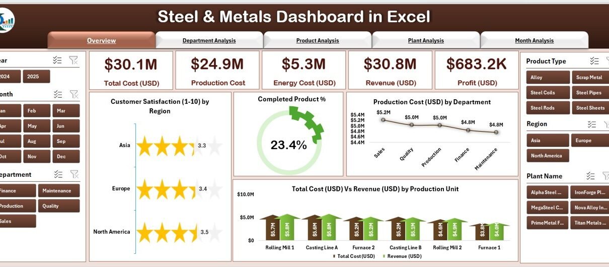 A Steel & Metals Dashboard in Excel is an advanced analytical tool built entirely in Microsoft Excel that helps track, visualize, and analyze key metrics from steel and metal production operations.