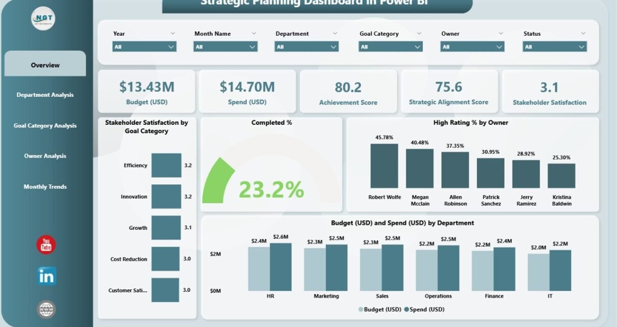 The Strategic Planning Dashboard in Power BI includes multiple pages that focus on different perspectives. Each page is designed with slicers, cards, and charts for clarity and interactivity. Below are the five major sections: