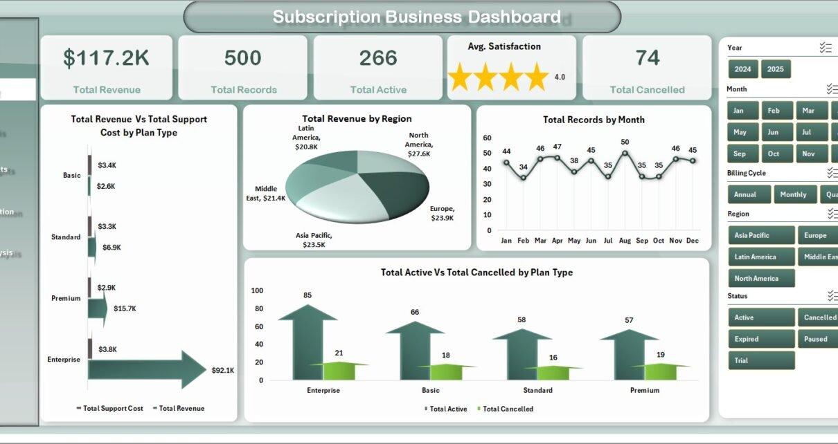 The Overview page serves as the main command center of the Subscription Business Dashboard in Excel. At the top, you will find 5 high-level KPI cards displaying Total Revenue, Total Records, Total Active, Avg. Satisfaction, and Total Cancelled. Below the cards, interactive charts visualize Total Revenue Vs Total Support Cost by Plan Type, Total Revenue by Region, Total Records by Month, and Total Active Vs Total Cancelled by Plan Type. Multiple slicers allow you to filter the entire dashboard for quick, focused analysis across different dimensions.