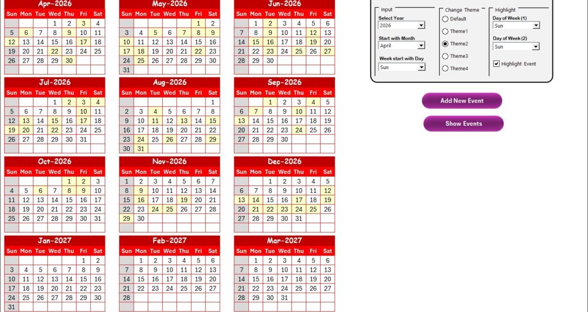 • Input Group: Select the year, starting month, and the starting weekday to automatically update the calendar.