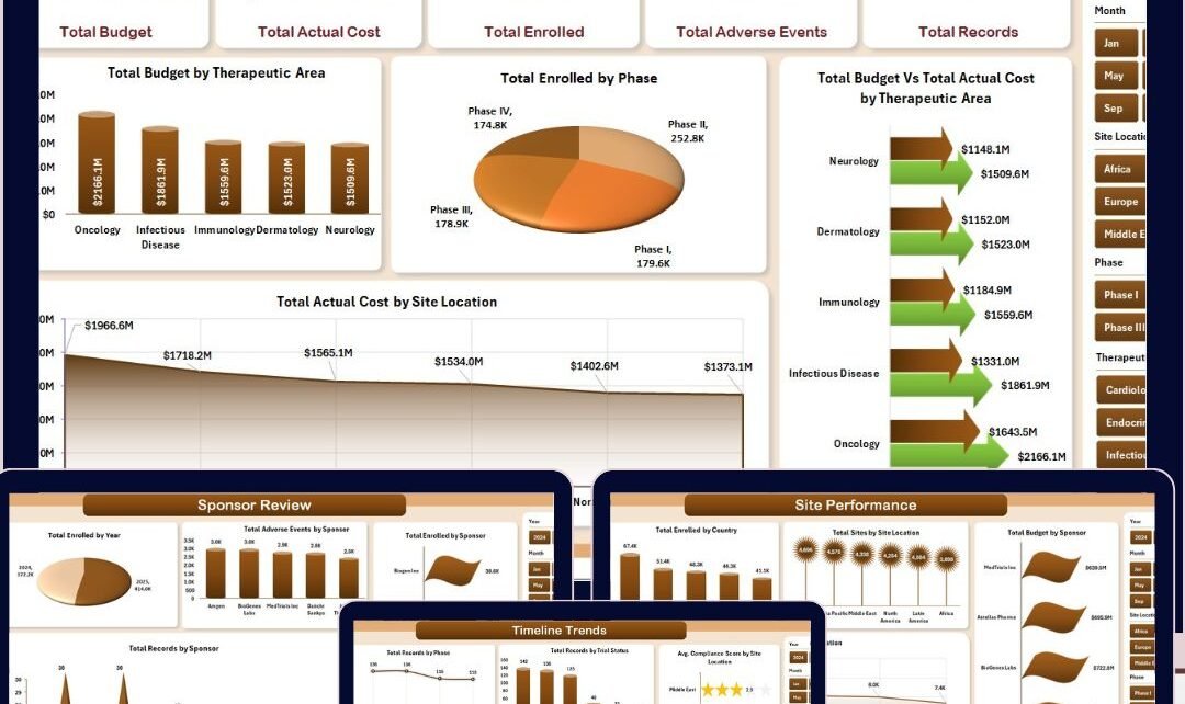 Clinical Trials Management Dashboard in Power BI is a professionally designed, ready-to-use analytics template built for pharmaceutical companies, clinical research organizations (CROs), and healthcare research teams who need to track