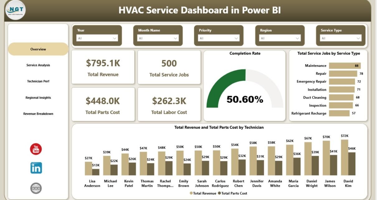 Running an HVAC service business means juggling dozens of data points every week — service calls, technician dispatches, parts cost, response times, customer ratings, and regional profit. When all of
