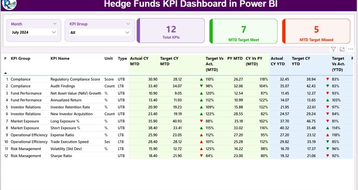 A Hedge Funds KPI Dashboard in Power BI is a ready-to-use, interactive reporting system designed to measure key investment performance indicators across multiple funds. It gives you a clear view