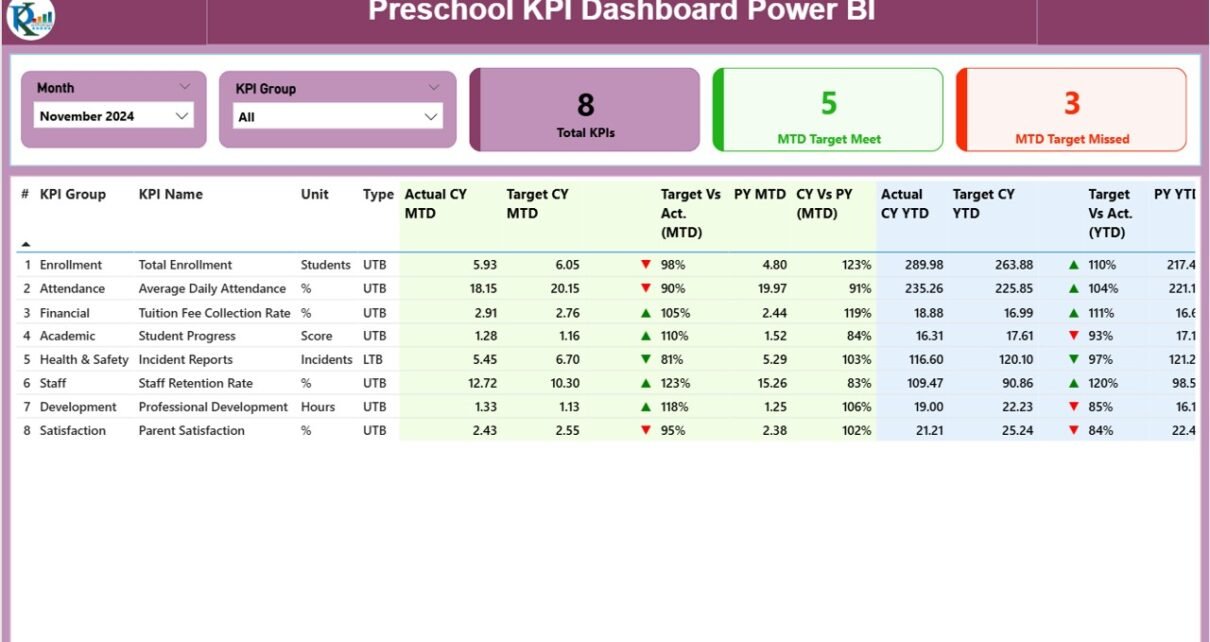 Managing and improving the performance of preschools requires clear data insights. School administrators, teachers, and management teams must track multiple aspects such as student attendance, staff efficiency, curriculum delivery, and