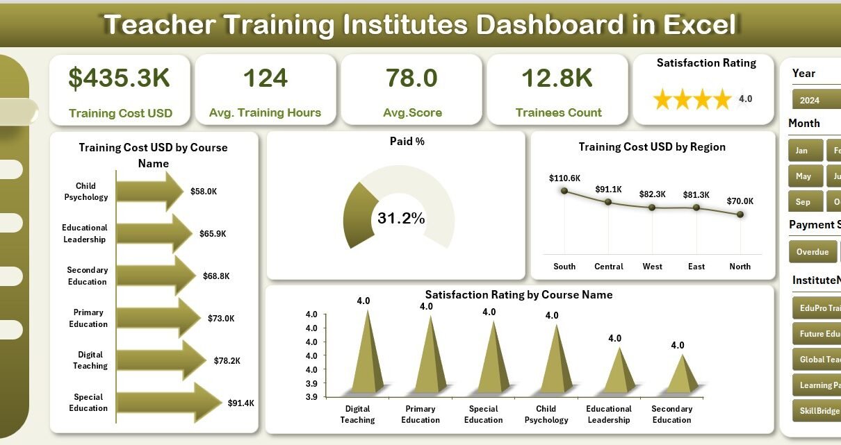 In the modern education sector, data plays a critical role in improving training efficiency, optimizing funding, and ensuring quality outcomes. Managing vast amounts of information from different training programs, institutes, and funding sources can be challenging — but with the Teacher Training Institutes Dashboard in Excel, everything becomes simple and visual.