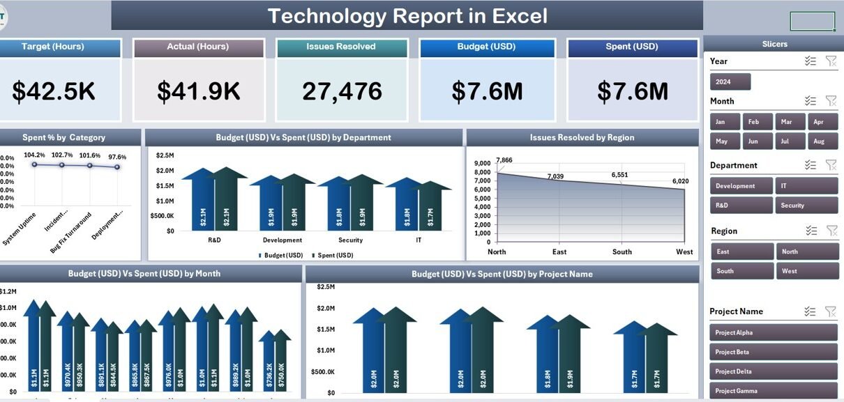 The Technology Report tracks 5 headline KPIs on the Summary Page shown as card visuals, plus 5 interactive charts: Spent % by Category, Budget vs Spend by Department, Issue Resolved by Region, Budget vs Spend by Month, and Budget vs Spend by Project Name. Every metric auto-updates when you refresh the pivot tables on the Support sheet.