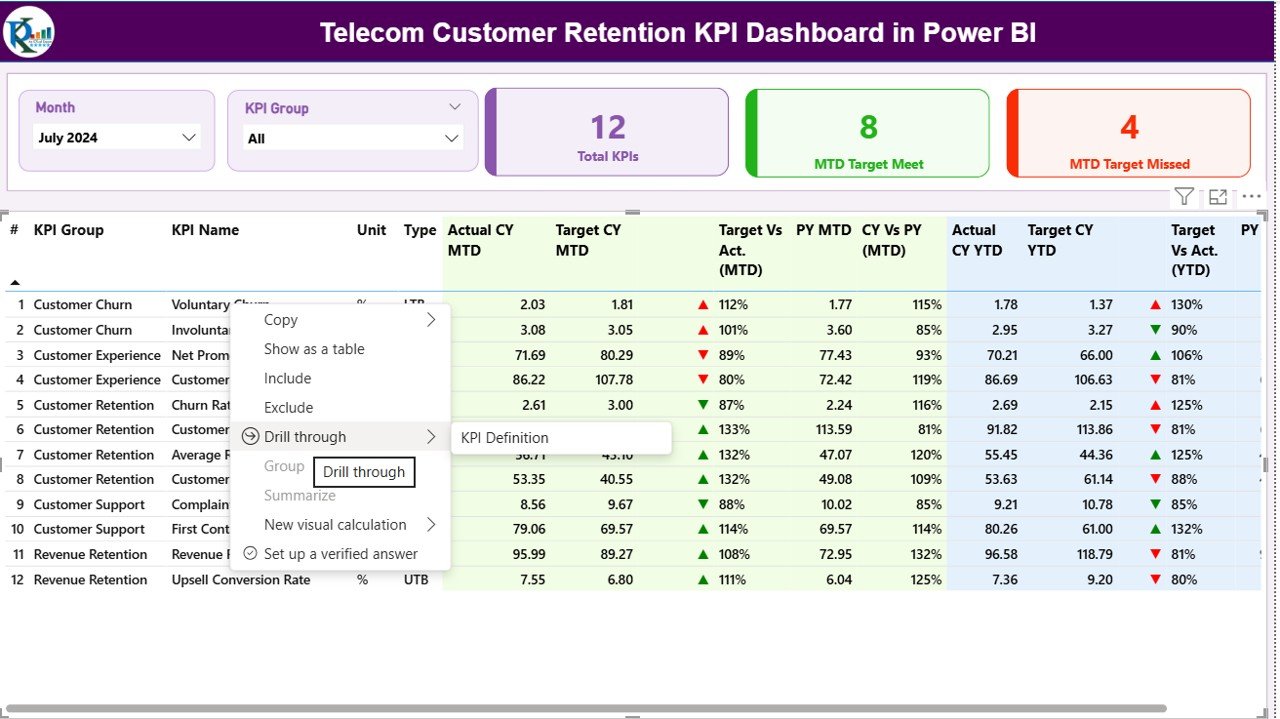 This structure gives managers a bird’s-eye view of customer retention metrics — instantly showing which KPIs need urgent attention.