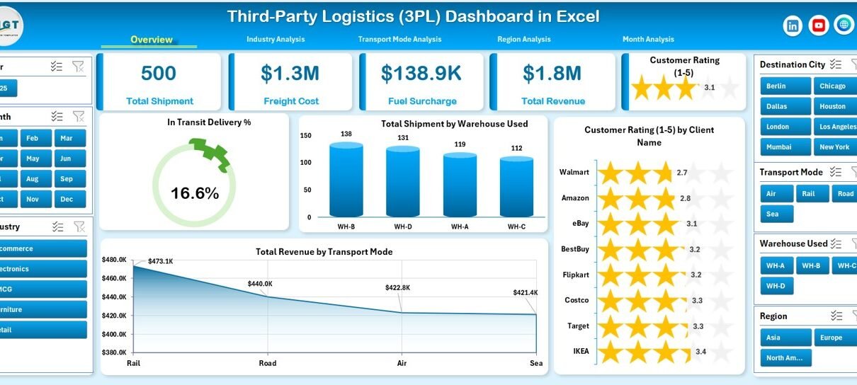 A Third-Party Logistics (3PL) Dashboard in Excel is an interactive performance monitoring tool built inside Microsoft Excel. It helps logistics companies track shipment performance, freight costs, fuel surcharges, warehouse usage, and customer ratings in one place.