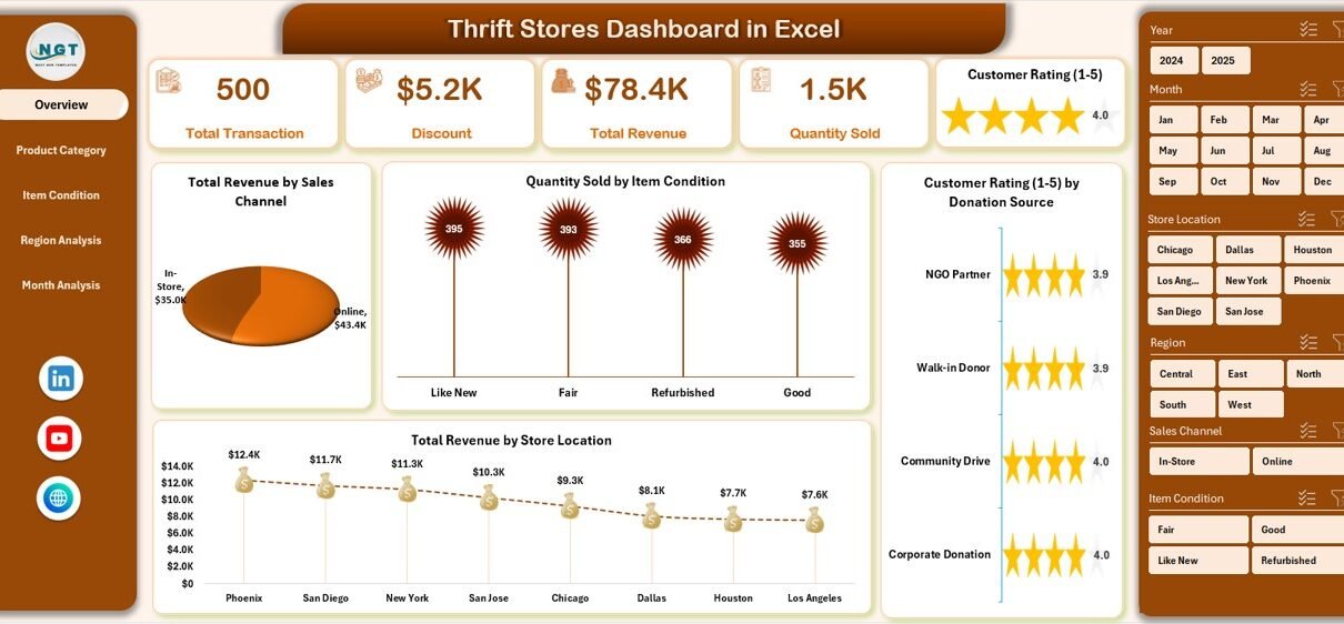 It is an interactive Excel tool that tracks thrift store KPIs such as revenue, product performance, customer ratings, and regional analytics.