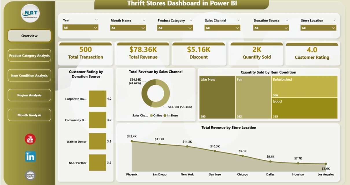 The Thrift Stores Dashboard includes five powerful report pages, each designed to answer specific business questions.