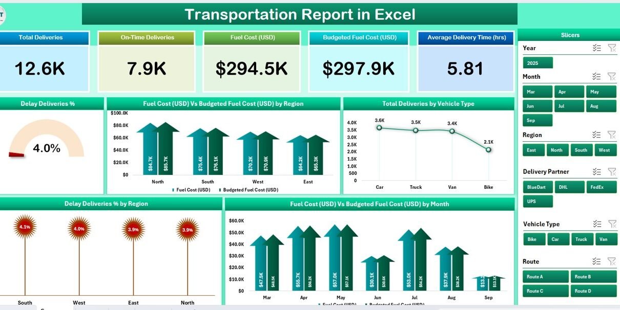 A Transportation Report in Excel is a data-driven reporting template designed to track, analyze, and visualize transportation performance metrics. It consolidates data from various logistics activities such as fuel cost, delivery time, delays, and route performance — all in one unified dashboard.