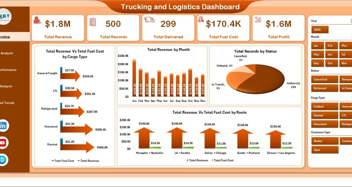 The Overview page serves as the command center of the Trucking and Logistics Dashboard in Excel. At the top, you’ll find 5 KPI summary cards displaying Total Revenue, Total Records, Total Delivered, Total Fuel Cost, and Total Profit. These cards provide an instant snapshot of your trucking operation’s health.
