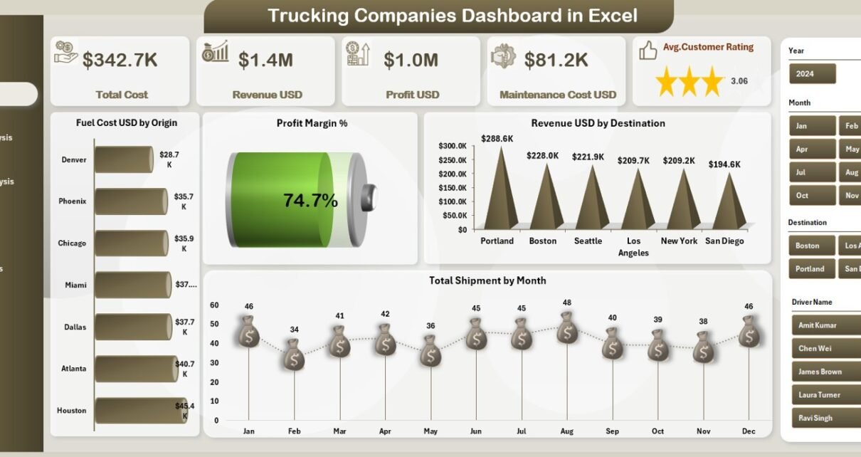 The Trucking Companies Dashboard in Excel gives trucking businesses a powerful, easy, and professional way to track fleet operations. With five detailed pages—Overview, Destination Analysis, Driver Analysis, Cost Analysis, and Monthly Trends—this dashboard becomes a complete solution for logistics performance tracking.