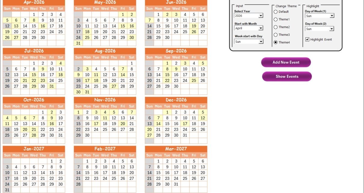 - Control panels to customize year, starting month, week start day, and themes.