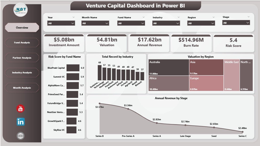 A Venture Capital Dashboard in Power BI helps investors manage complex portfolios with ease. It simplifies data, improves transparency, and supports informed decisions. With pages for funds, partners, industries, and monthly trends, investors get a complete view of their portfolio performance.