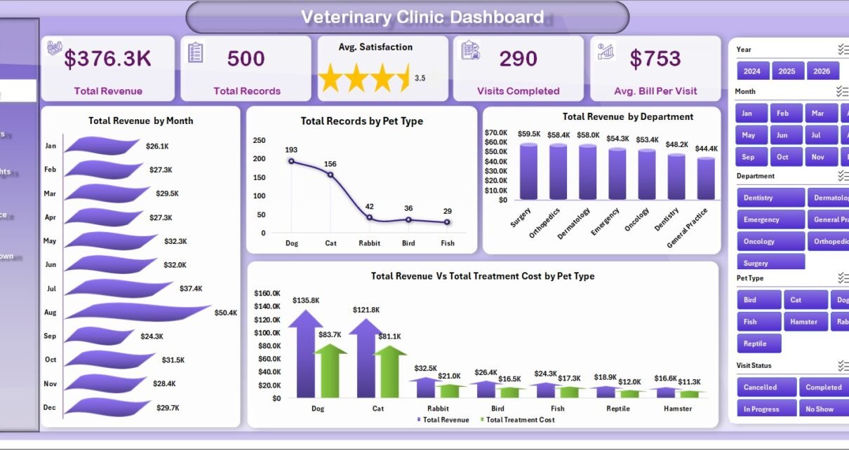 Modern veterinary practices handle hundreds of patient records, multiple veterinarians, various treatment types, and diverse revenue streams. Without a centralized reporting tool, clinic managers often rely on scattered spreadsheets or manual summaries. The Veterinary Clinic Dashboard in Excel solves this by bringing all your clinic data into one place with visual charts, KPI cards, and slicer filters that let you slice through data effortlessly.
