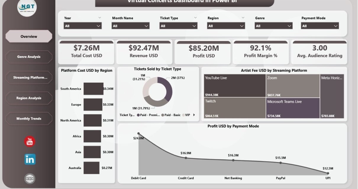 The Virtual Concerts Dashboard in Power BI from NextGenTemplates is one of the best templates available. It includes 5 interactive pages covering financial overview, genre analysis, streaming platform comparisons, regional performance, and monthly trends with KPI cards and dynamic slicers.