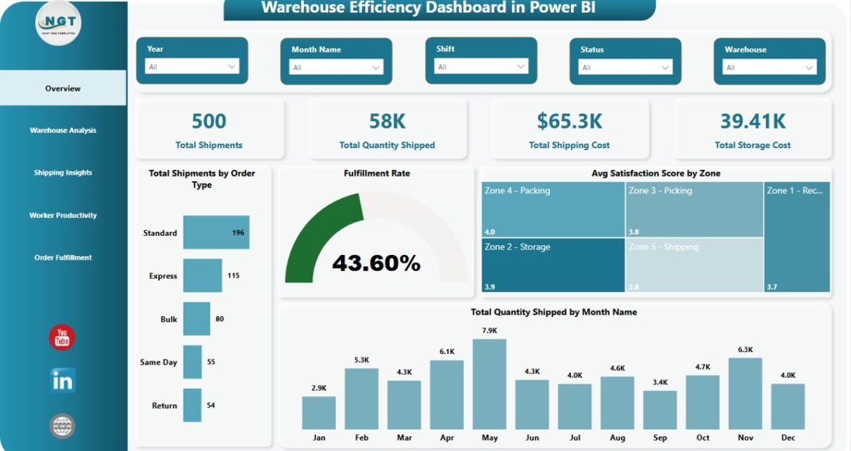 The Warehouse Efficiency Dashboard in Power BI tracks 4 executive KPIs on the Overview page — Total Shipments, Total Quantity Shipped, Total Shipping Cost, and Total Storage Cost — along with derived metrics across the other pages including Fulfillment Rate, Avg Pick Time by Zone and by Shift, and Avg Satisfaction Score by Zone.