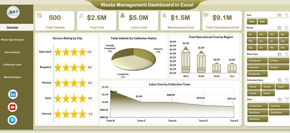 This Waste Management Dashboard in Excel contains 5 fully interactive analytical pages. Each page focuses on a specific dimension of operations.