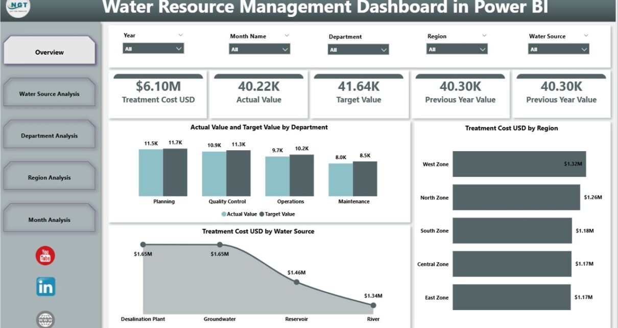 The Water Resource Management Dashboard in Power BI solves these challenges by providing interactive analysis across:
