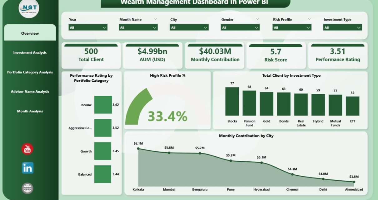 A Wealth Management Dashboard in Power BI is a visual reporting tool that tracks client portfolios, investment performance, risk levels, AUM trends, diversification scores, and monthly contributions. It helps wealth managers and financial advisors understand where money flows, how portfolios grow, and which areas need improvement.