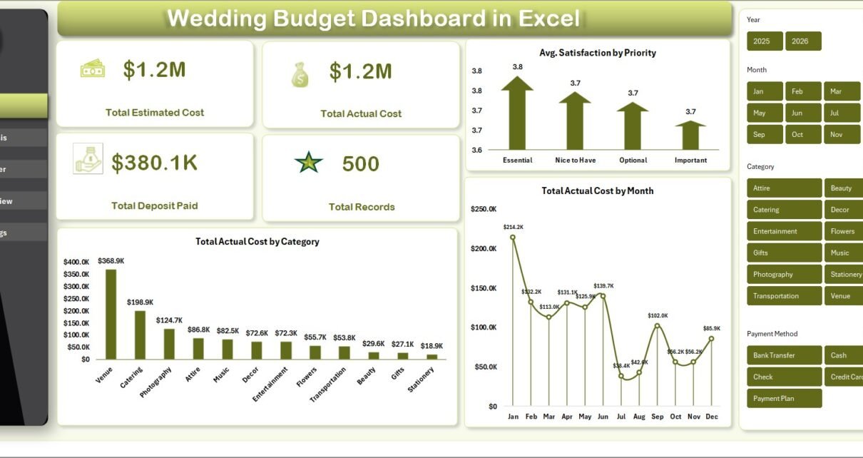The Overview page serves as your wedding budget command center. At the top, you will find 4 KPI summary cards displaying Total Estimated Cost, Total Actual Cost, Total Deposit Paid, and Total Records. Below the cards, interactive charts provide visual analysis including Avg. Satisfaction by Priority, Total Actual Cost by Month, and Total Actual Cost by Category. Multiple slicers allow you to filter the entire dashboard by any dimension instantly, giving you a quick snapshot of your wedding finances from any angle.